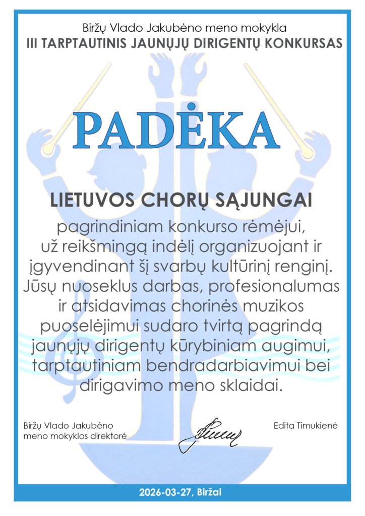 Lietuvos chorų sąjunga nuoširdžiai dėkoja Biržų Vlado Jakubėno meno mokyklai, konkurso organizatorėms Viktorijai Morkūnienei ir Ievai Morkūnaitei už prasmingą ir nuoseklų darbą, jau trečią kartą suburiant jaunąją dirigentų kartą. Džiugu matyti tokį gyvą ir entuziastingą šio konkurso organizavimą – tikimės jo tęstinumo ir ateityje.