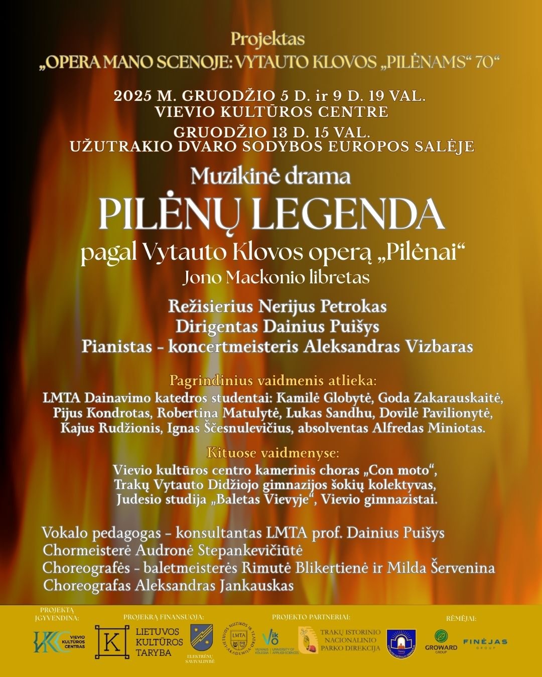 Muzikinės dramos „Pilėnų legenda“ pagal Vytauto Klovos operą „Pilėnai“ premjeriniai spektakliai Vievio kultūros centro scenoje pasirodys gruodžio 5 ir 9 d., Užutrakio dvaro sodybos Europos salėje – gruodžio 13 d. Šis projektas – puikus profesionalaus meno ir mėgėjų meno integracijos pavyzdys: jame dalyvauja LMTA Dainavimo katedros studentai bei pedagogai ir Vievio bei Trakų mėgėjų meno kolektyvai, tarp kurių – Vievio kultūros centro kamerinis choras „Con moto“. Šio pastatymo režisierius – Nerijus Petrokas, dirigentas – Dainius Puišys, koncertmeisteris – pianistas Aleksandras Vizbaras.