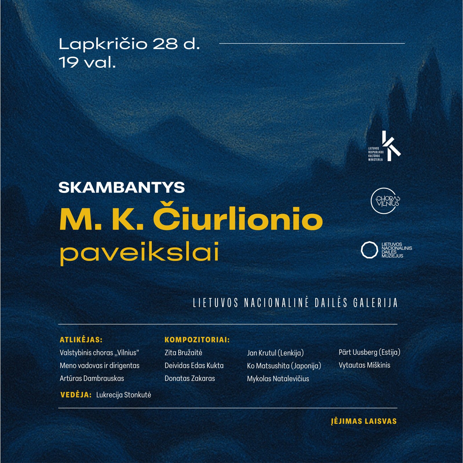 Lapkričio 28 dieną, 19 val., Lietuvos nacionalinėje dailės galerijoje, Valstybinio choro „Vilnius“ inicijuotas projektas – ,,Skambantys M. K. Čiurlionio paveikslai” kviečia išgirsti muziką užkoduotą garsaus Lietuvos dailininko ir kompozitoriaus paveiksluose.
