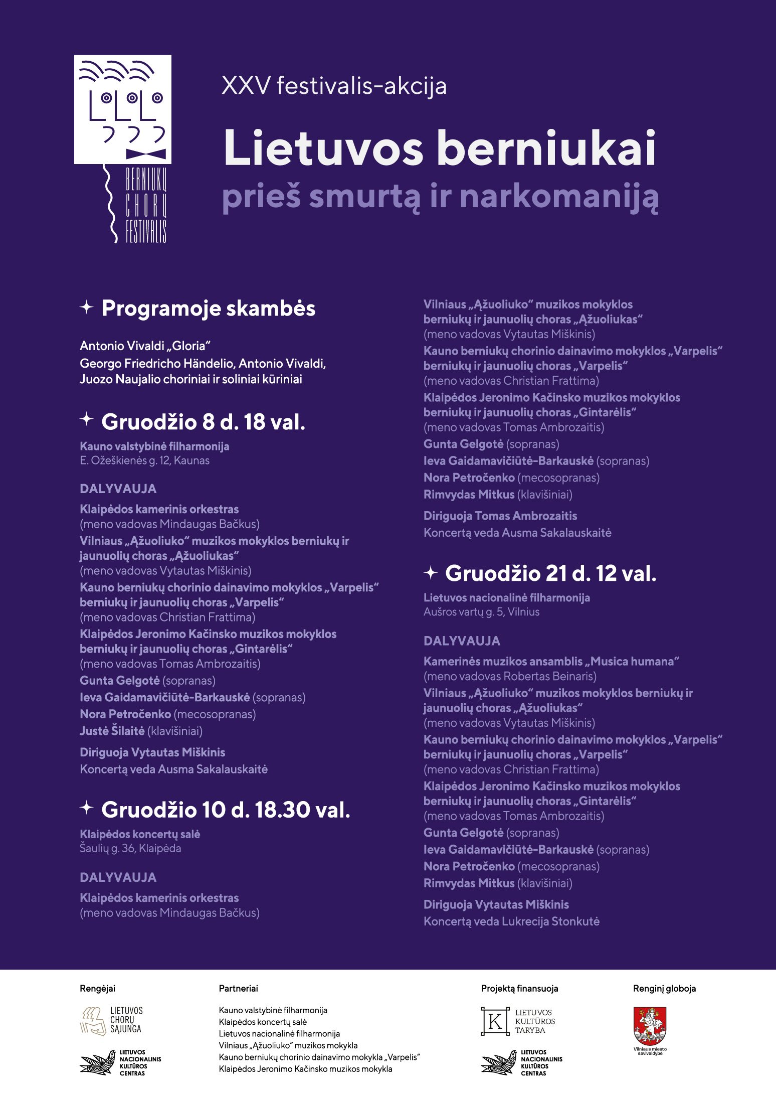 Koncertuose skambės italų baroko kūrėjo Antonio Vivaldi šedevras „Gloria“, skirtas dideliam chorui, dviem sopranams, altui ir orkestrui, arijos iš Georgo Frydricho Hendelio oratorijos „Laiko ir Tiesos triumfas“, Juozo Naujalio kalėdinės giesmės „Sveikas, Jėzau gimusis“ ir „Tyliąją naktį“.