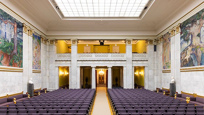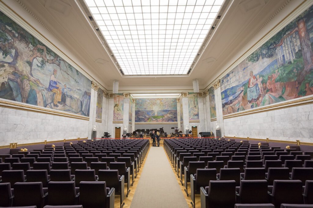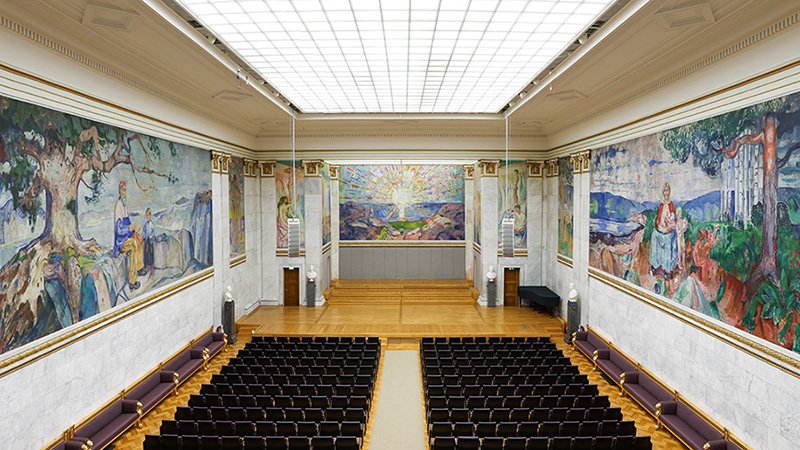 universiteto auloje, kurią puošia net 11 E. Muncho paveikslų, nutapytų aliejumi ant